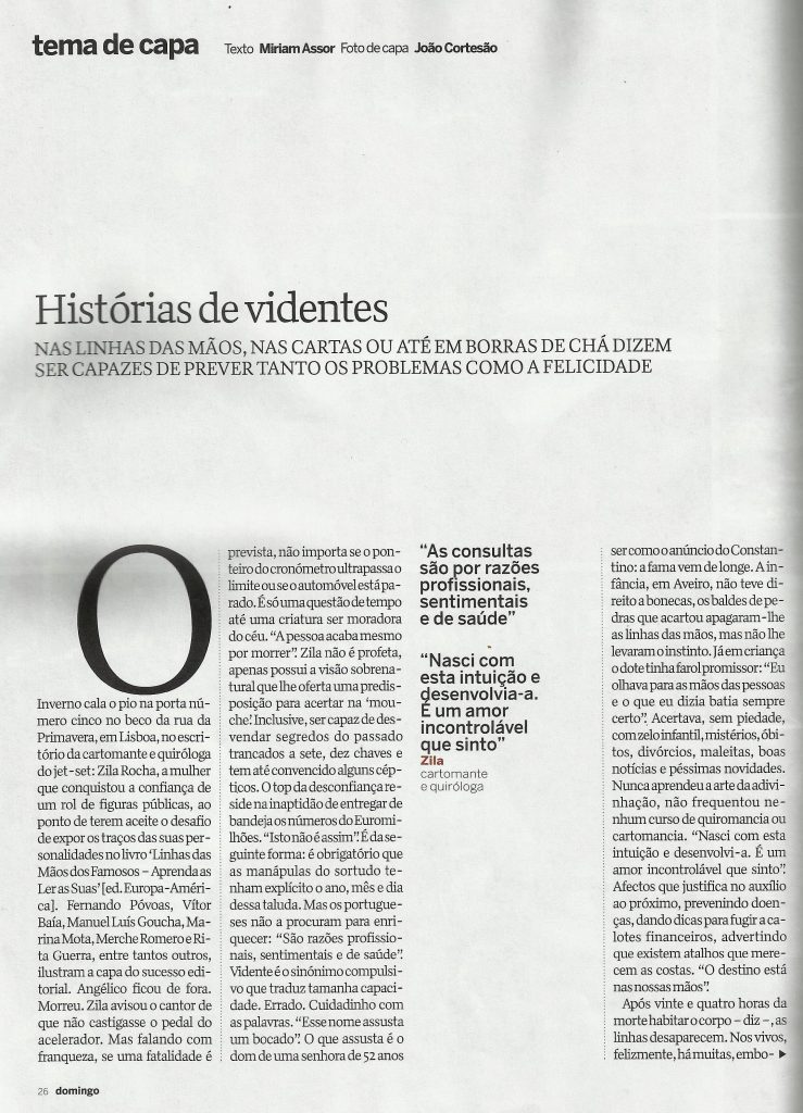 O Inverno cala o pio na porta número cinco no beco da rua da Primavera, em Lisboa, no escritório da cartomante e quiróloga do jet-set: Zila Rocha, a mulher que conquistou a confiança de um rol de figuras públicas, ao ponto de terem aceite o desafio de expor os traços das suas personalidades no livro ‘Linhas das Mãos dos Famosos – Aprenda as Ler as Suas’ [ed. Europa-América]. Fernando Póvoas, Vítor Baía, Manuel Luís Goucha, Marina Mota, Merche Romero e Rita Guerra, entre tantos outros, ilustram a capa do sucesso editorial. Angélico ficou de fora. Morreu. Zila avisou o cantor de que não castigasse o pedal do acelerador. Mas falando com franqueza, se uma fatalidade é prevista, não importa se o ponteiro do cronómetro ultrapassa o limite ou se o automóvel está parado. É só uma questão de tempo até uma criatura ser moradora do céu. “A pessoa acaba mesmo por morrer”.