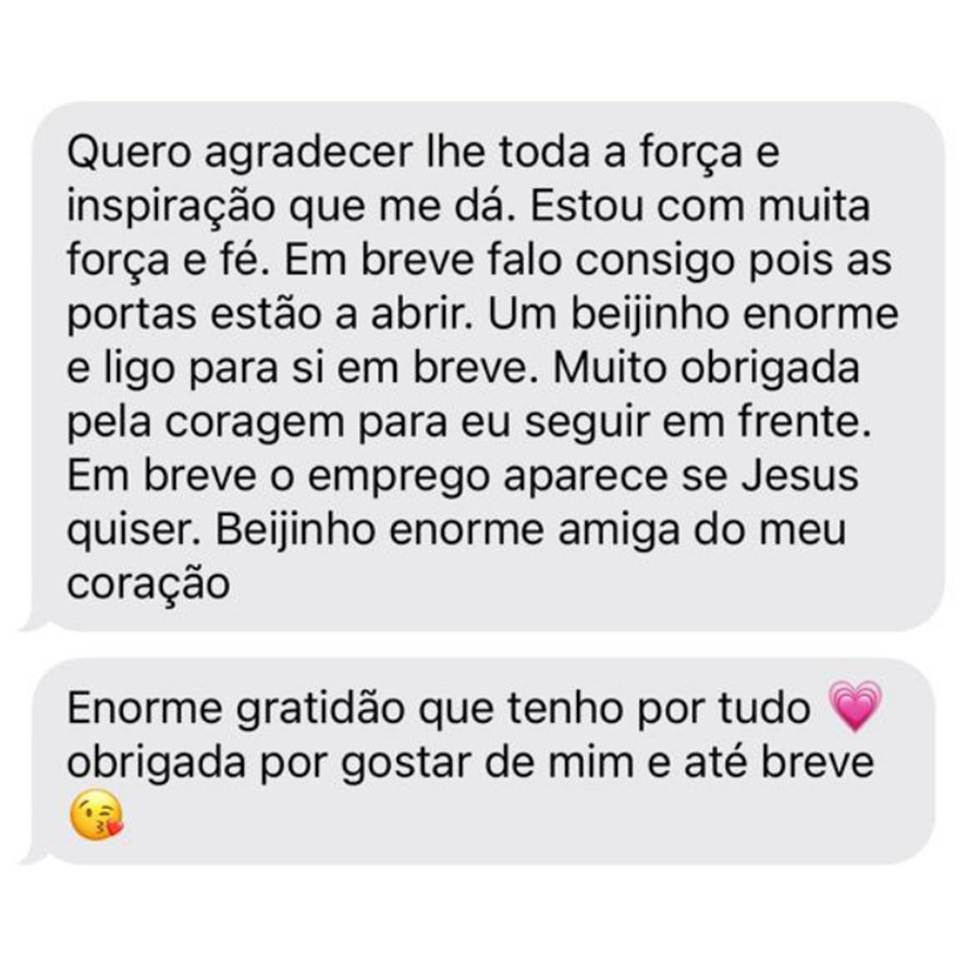 Quero agradecer lhe toda a força e inspiração que me dá. Estou com muita força e fé. Em breve falo consigo pois as portas estão a abrir. Um beijinho enorme e ligo para si em breve. Muito obrigada pela coragem para eu seguir em frente. Em breve o emprego aparece se Jesus quiser. Beijinho enorme amiga do meu coração