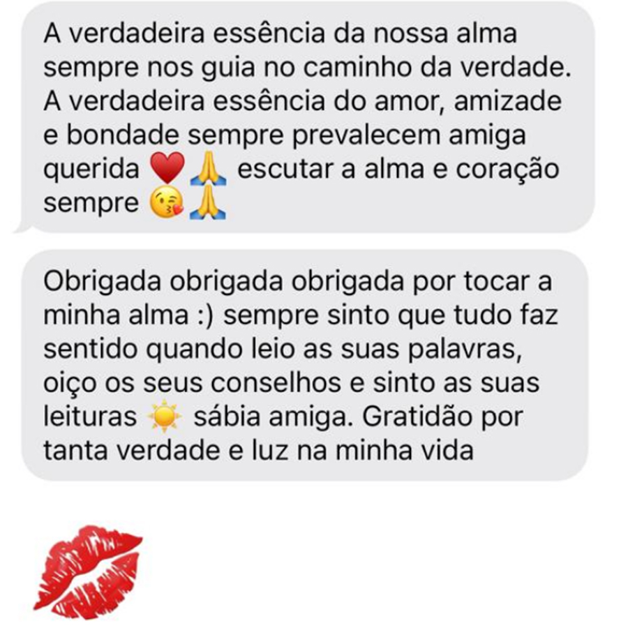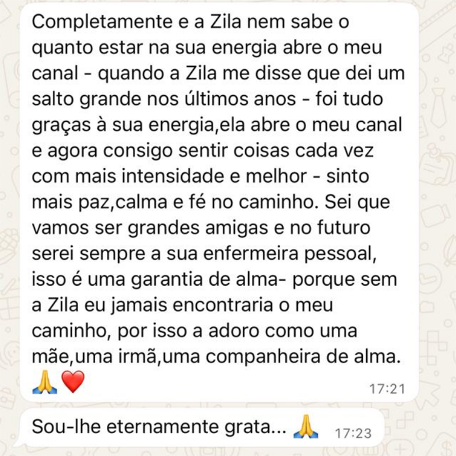 Completamente e a Zila nem sabe o quanto estar na sua energia abre o meu canal – quando a Zila me disse que dei um salto grande nos últimos anos – foi tudo graças à sua energia, ela abre o meu canal e agora consigo sentir coisas cada vez com mais intensidade e melhor – sinto mais paz, calma e fé no caminho. Sei que vamos ser grandes amigas e no futuro serei sempre a sua enfermeira pessoal, isso é uma garantia de alma- porque sem a Zila eu jamais encontraria o meu caminho, por isso a adoro como uma mãe, uma irmã, uma companheira de alma.