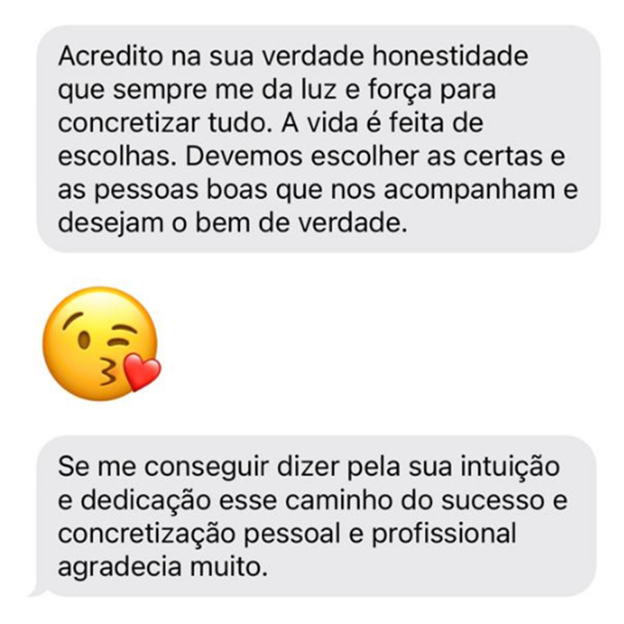 Acredito na sua verdade honestidade que sempre me da luz e força para concretizar tudo. A vida é feita de escolhas. Devemos escolher as certas e as pessoas boas que nos acompanham e desejam o bem de verdade.