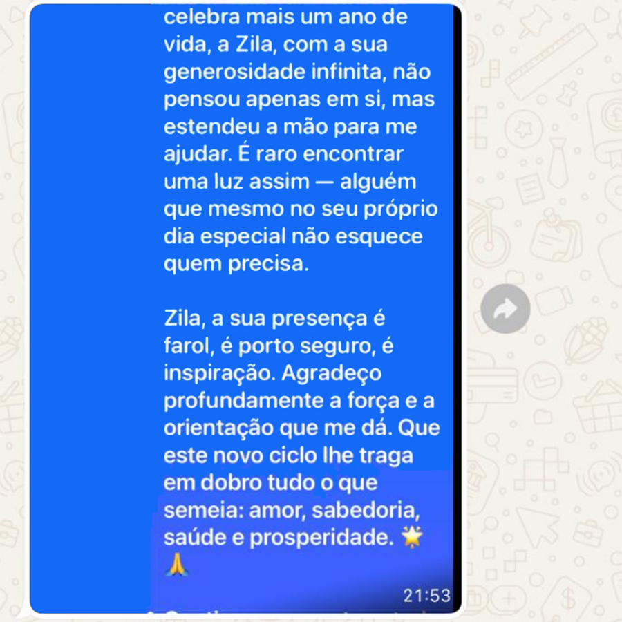 Zila, a sua presença é farol, é porto seguro, é inspiração. Agradeço profundamente a força e a orientação que me dá. Que este novo ciclo lhe traga em dobro tudo o que semeia: amor, sabedoria, saúde e prosperidade.